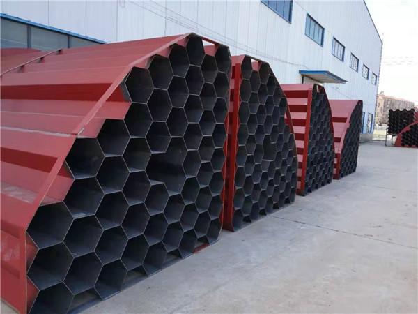 (3)蜂窩式電捕焦油器。蜂窩式與管式的結構相同,是將通道截面由圓形改為正六邊形。兩個相鄰正六邊形共用一條邊,即靠中間的正六邊形的六條邊均被包圍它的六個正六邊形所共用。用2~3mm的鋼板制成的蜂窩板即可滿足工藝和機械強度的要求。由于蜂窩式電捕焦油器具有結構緊湊合理、沒有電場空穴、有效空間利用率高、重量輕、耗鋼材少和捕集特性好等優點,但存在制造難度大,在運輸安裝過程中易產生誤差等缺點。隨著設備制造工藝水平的提高,蜂窩式電捕焦油器的優點會越來越受到人們的重視,必將逐步取代同心圓式和管式電捕焦油器。鈺泰環保生產蜂窩式電捕焦油器