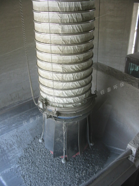 溜筒外部是用鋼圈骨架支撐的防塵罩,裝車機在工作時,使物料與溜筒出料口之間形成相對密閉的空間,形成吸塵點。溜筒出口處的吸塵點、溜筒吸塵腔、臂架除塵管網和除塵器等構成裝車機獨立的除塵系統。在除塵器離心風機的驅動下,在溜筒出口處的吸塵點形成足夠的空氣流量和負壓,實現負壓吸塵的目的。